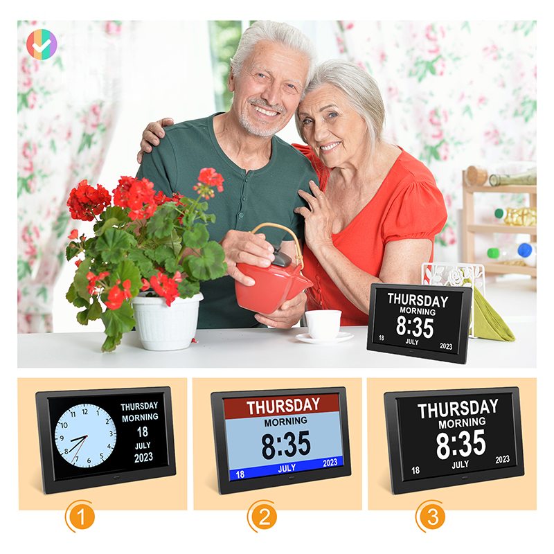 10.1-inch dementia clock is designed to simplify the daily lives of people with memory disorders, that important tasks are never forgotten. The clock automatically dimmers at night, providing a more comfortable viewing experience in low-light conditions. Automatically broadcast the current date and time to help the user keep direction.