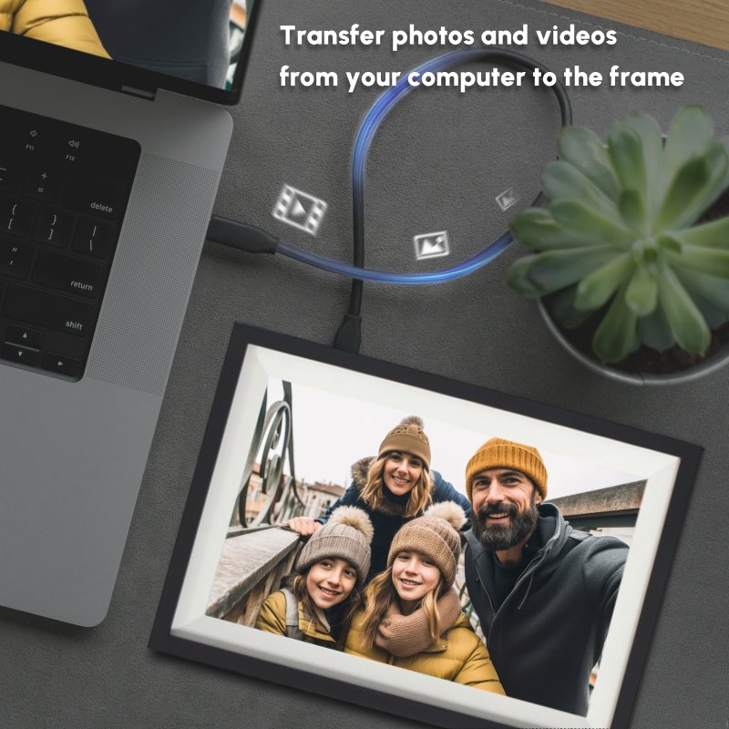 Connect the frame directly to your computer for quick and stable file transfers—perfect for photos, videos, and playlists.